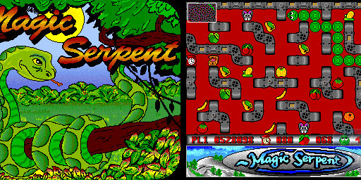Magic Serpent ist eine Schlange Variante. Der Spieler steuert eine Schlange namens Lenni, die alle Früchte, die über das Scroll-Level verteilt sind, fressen muss. Diese Ebenen sind wie Labyrinthe aufgebaut, dh. viele kleine Gänge. Jedes Mal, wenn eine Frucht gegessen wird, wächst die Länge von Lenni. Der Spieler muss Lenni so kontrollieren (er bewegt und dreht sich automatisch, wenn er auf eine Wand trifft; der Spieler muss nur eingreifen, wenn ein weiterer Zug ansteht) so zu steuern, dass er sich selbst in den Weg stellt. Jeder Level muss innerhalb von 60 Sekunden abgeschlossen werden, aber das Sammeln von Uhren verlängert dieses Limit. Andere Power-Ups sind Hasen (machen Lenni schneller), Schnecken (machen Lenni langsamer, aber nicht langsamer als die Standardgeschwindigkeit), Äxte (die Länge von Lenni wird auf den Startwert reduziert) und Teleports zum Startpunkt des Levels . Jedes Power-Up wirkt sich auch auf die Punkte aus.