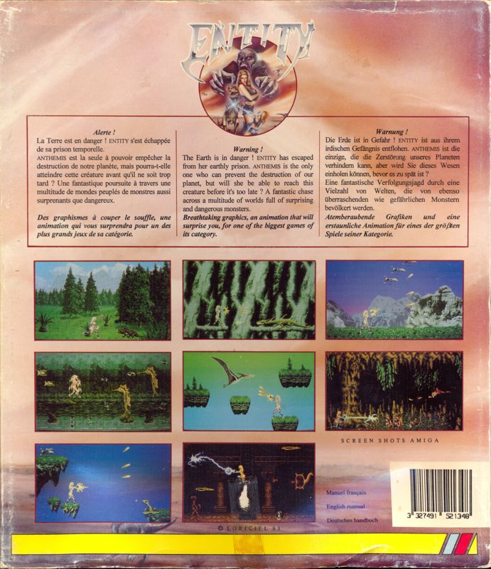 Entity ist ein seitlich scrollendes Jump’n’Run-Spiel, in dem du eine Frau (nur mit dem Nötigsten bekleidet) steuerst, die versucht, einen Planeten vor einer bösartigen Kreatur (der Entität) zu retten, die aus ihrem versteinerten Zustand erwacht ist und nun Chaos anrichten will. Ein Ältester teilt ihr mit, dass sie die Auserwählte ist, die wir im Intro zu sehen bekommen.